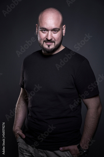 © Анна Демидова, Naklejka premium Smiling bald man with a beard stands on a black background. Brutal guy in a black T-shirt. Vertical.