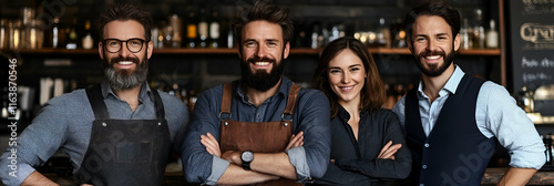 Obraz premium Smiling Bar Staff Team in a Cozy Pub, Ready to Serve Drinks Enthusiastically