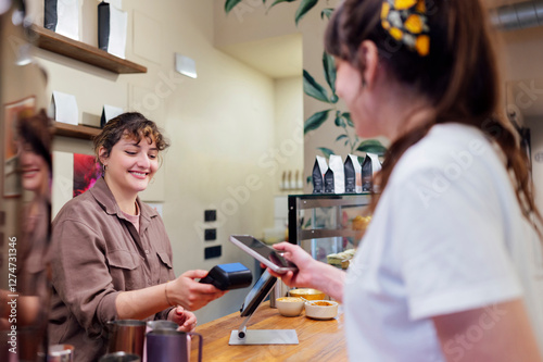 © Miguel Lifestyle, Fototapeta premium Smiling barista holding POS terminal while customer paying with smartphone using NFC technology
