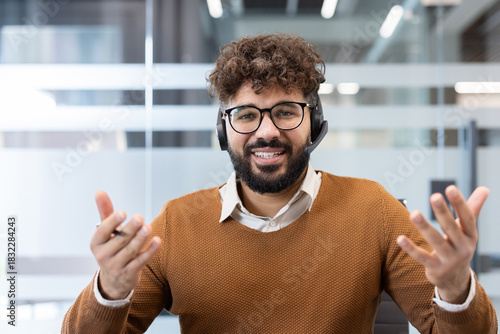 © Liubomir, Obraz premium Smiling bearded man working as customer service in an office, wearing a headset and glasses, actively communicating and providing support during a video call