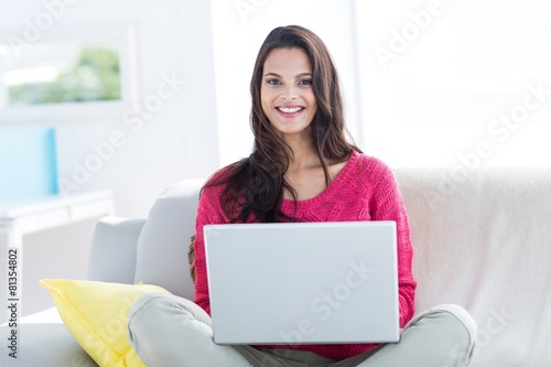 Fototapeta premium Smiling beautiful brunette doing online shopping