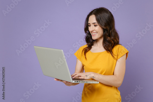© ViDi Studio, Fototapeta premium Smiling beautiful pretty young brunette woman 20s wearing basic yellow t-shirt posing standing hold in hands working on laptop pc computer isolated on pastel violet colour background, studio portrait.
