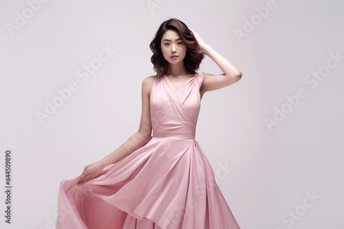 Fototapeta premium Smiling Beautiful young Asian woman in stylish pink dress in pastel pink dress posing at studio. Generative AI.