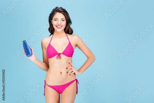 © Drobot Dean, Naklejka premium Smiling beautiful young girl holding cocktail in swimsuit