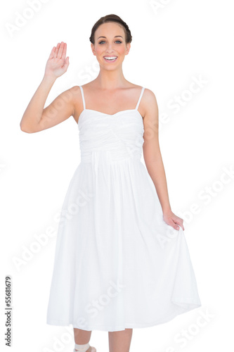 Naklejka premium Smiling beautiful young model in white dress waving