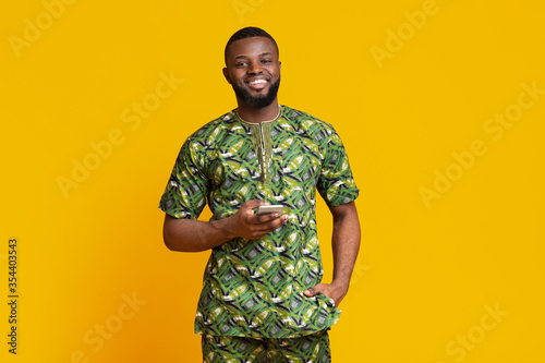 © Prostock-studio, Fototapeta premium Smiling black guy in african costume using mobile phone