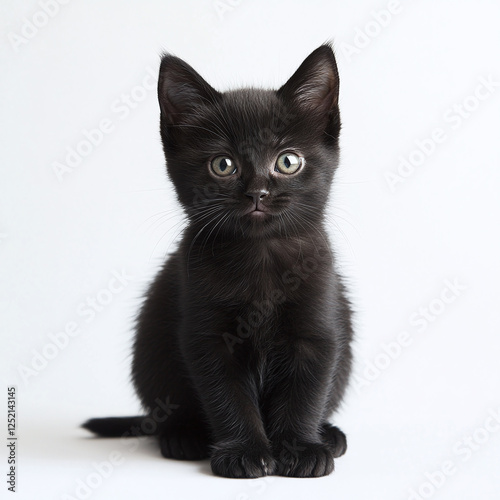 © Infinity Lens, Obraz premium Smiling black kitten sitting on white background.