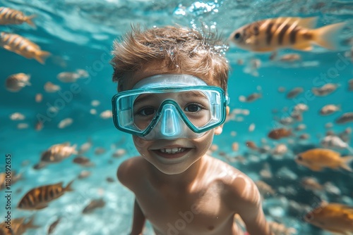 Fototapeta premium Smiling boy wearing a diving mask underwater, surrounded by colorful fish. Perfect for travel, summer, or children's themes; evokes joy and underwater adventure.