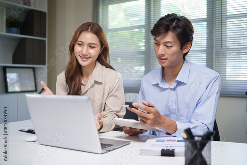 © matinee, Obraz premium Smiling business team discussing numbers and checking calculations while using a laptop.