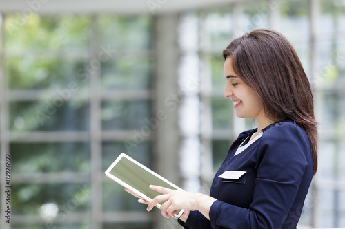 Obraz premium Smiling business woman holding a tablet computer at the office