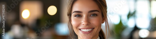 © Aidas, Fototapeta premium Smiling businesswoman in formal attire holding clipboard looking at camera in office