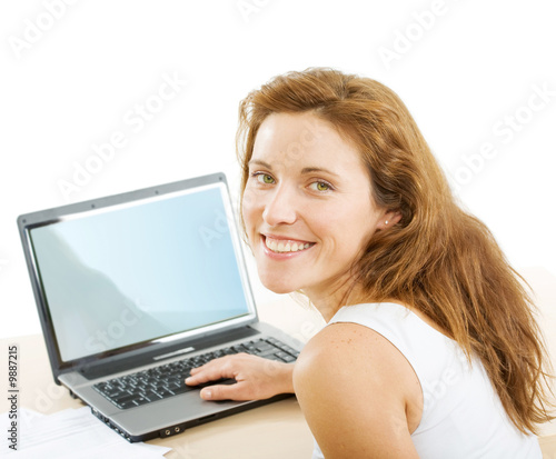 © chagin, Fototapeta premium Smiling businesswoman touching keys of laptop near by