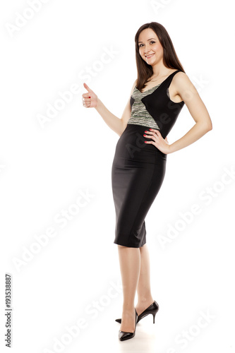 © vladimirfloyd, Fototapeta premium Smiling businesswoman with thumbs up standing on white background
