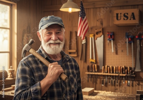 Obraz premium Smiling carpenter with hammer in workshop tools USA flag and wood shavings