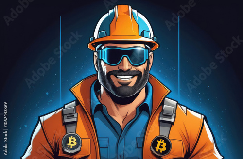 © Artem Zatsepilin, Fototapeta premium smiling cartoon bearded male miner in protective glasses, helmet with bitcoin logo on clothes. cryptocurrency mining, blockchain concept. futuristic technology, innovation, crypto currency, investment