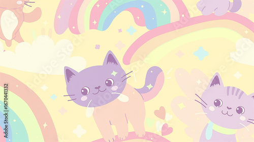 Fototapeta premium Smiling Cartoon Cats with Rainbows and Stars Cute Themed Illustration