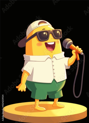 Fototapeta premium Smiling Cartoon Character Singing with Microphone
