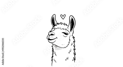 Fototapeta premium Smiling cartoon llama with heart above head, drawn in black and white on...