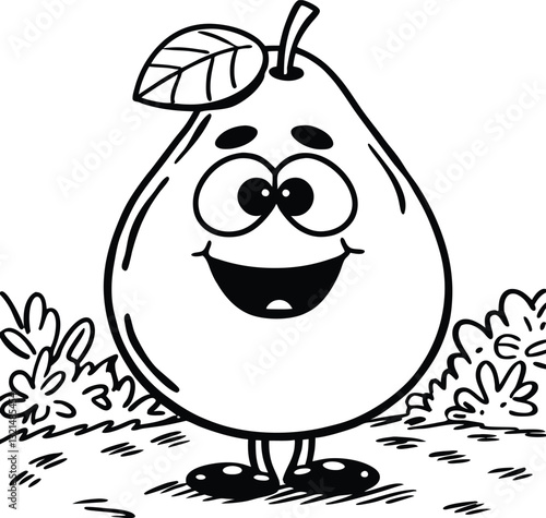 Obraz premium Smiling Cartoon Pear With Large Eyes and Leaf in Black and White
