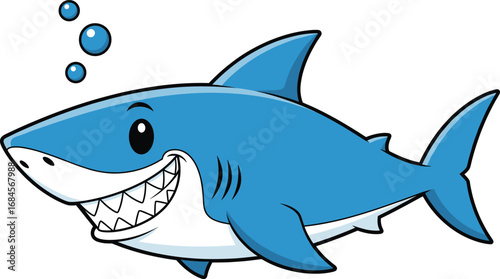 Obraz premium Smiling cartoon shark underwater with bubbles vector illustration featuring friendly expression, sharp teeth, and playful marine character for children’s content