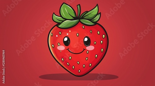 © Oksana Arhangelova, Obraz premium Smiling cartoon strawberry with green leaves on red background