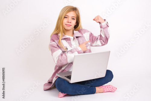 © Jihan, Fototapeta premium Smiling caucasian teen girl sitting with laptop in lotus position on white background raises hand to show muscles, feels confident in victory, strong and independent.