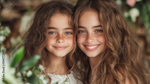 © O, Obraz premium Smiling caucasian young girls with long hair surrounded by flowers. Happy day to the siblings, sisters, girlfriends, friendship