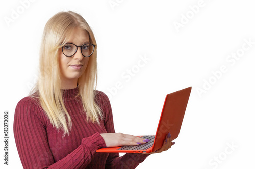 © frank11, Naklejka premium Smiling caucasian young woman using laptop isolated in white background. Horizontally.