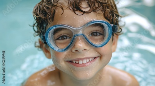 © MABRUR, Fototapeta premium Smiling child in goggles, pool