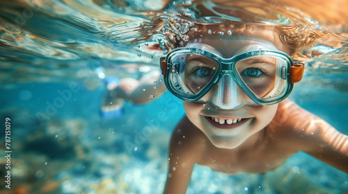 Naklejka premium Smiling child snorkeling underwater with diving mask, sea exploration portrait.