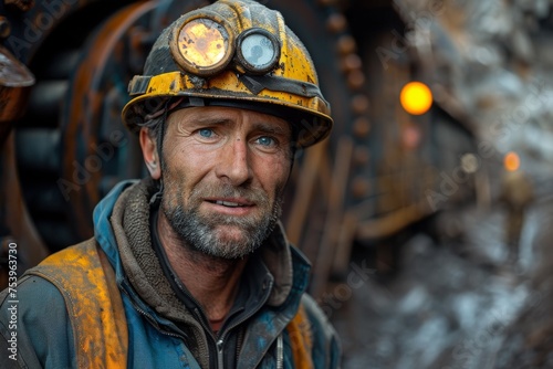 Fototapeta premium Smiling coal miner with a helmet and light against a dark background