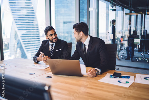 © BullRun, Fototapeta premium Smiling colleagues discussing strategy in office