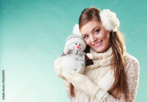 © Voyagerix, Obraz premium Smiling cute woman with little snowman. Winter.