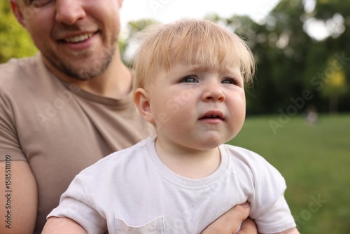 Fototapeta premium Smiling dad and his newborn baby outdoors, closeup. Happy Father's Day