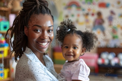 Fototapeta premium Smiling dark-skinned nanny at work, showcasing warmth and professionalism