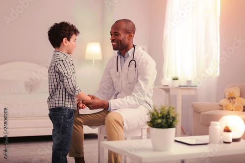 Obraz premium Smiling doctor calming child and preparing child for examination