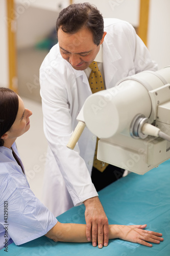 Obraz premium Smiling doctor placing the arm of a patient on a table