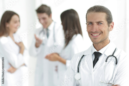 © ASDF, Fototapeta premium smiling doctor therapist on blurred background.