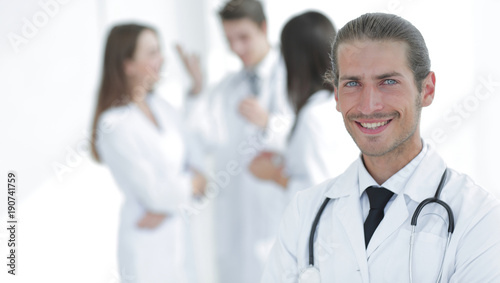 © ASDF, Fototapeta premium smiling doctor therapist on blurred background.