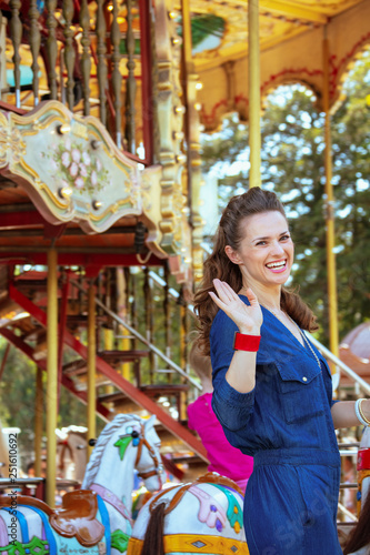 Obraz premium smiling elegant tourist woman riding on carousel and waving