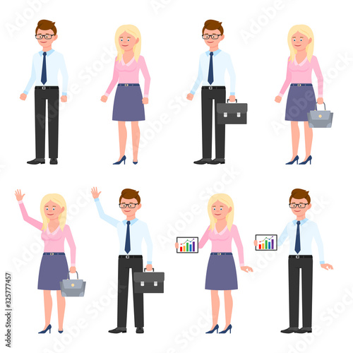 © Cherstva, Fototapeta premium Smiling, elegant, young business man and woman vector illustration. Standing side view, waving hello, using tablet glasses office boy and blonde girl cartoon character set on white