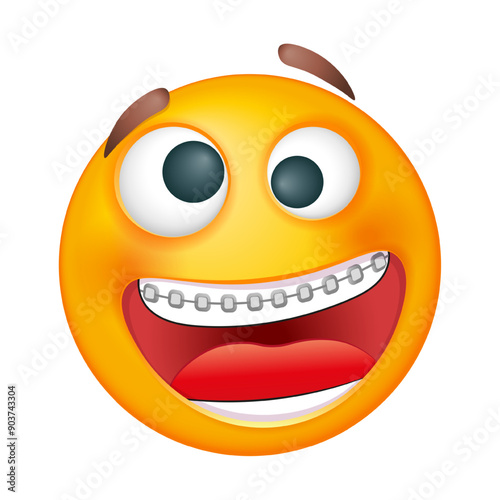 Fototapeta premium Smiling emoji with dental teeth braces. Emoticon on white background. Cute emoticon