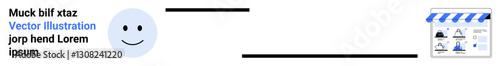Fototapeta premium Smiling face next to text and blue Vector illustration link, followed by additional text and small business storefront icon with blue roof. Ideal for web design, e-commerce, branding, marketing, user