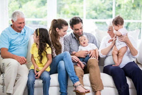 Obraz premium Smiling family with grandparents sitting on sofa