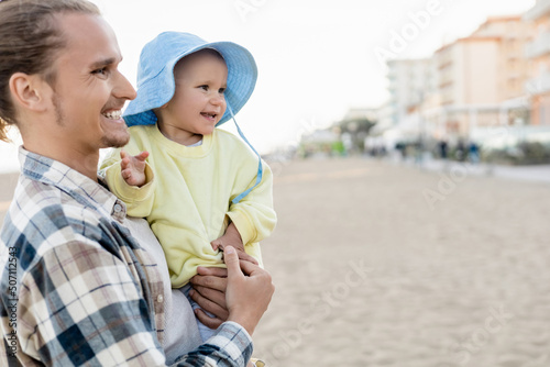 Fototapeta premium Smiling father and baby girl looking away on beach in Italy.