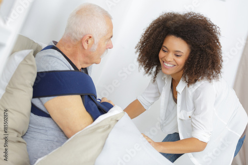 © auremar, Obraz premium smiling female assitant with senior man on bed at home