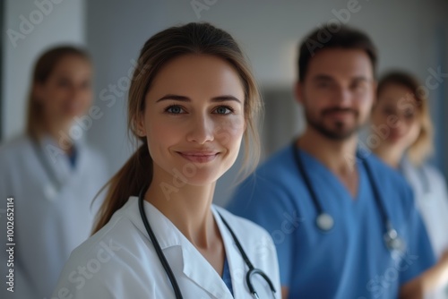 © Jose, Fototapeta premium Smiling female doctor with medical team in the background