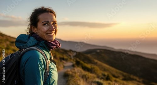 Naklejka premium Smiling female hiker enjoying sunset on mountain trail