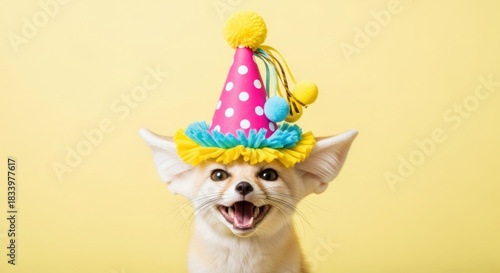 Naklejka premium Smiling fennec fox with large ears wearing a colorful party hat on a yellow...