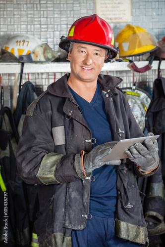Obraz premium Smiling Fireman Holding Digital Tablet At Fire Station